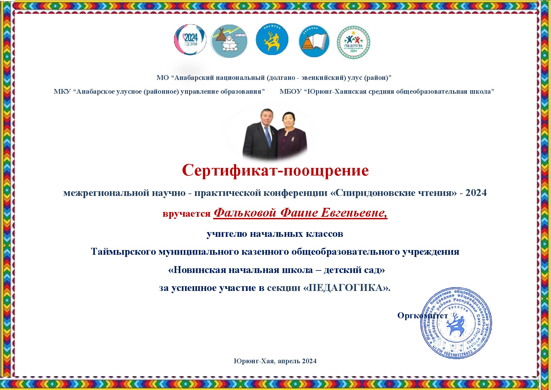 Сертификат поощрение в межрегиональной научно - практической конференции «Спиридоновские чтения» - 2024, было вручено учителю нач.классов Фальковой Фаине Евгеньевне