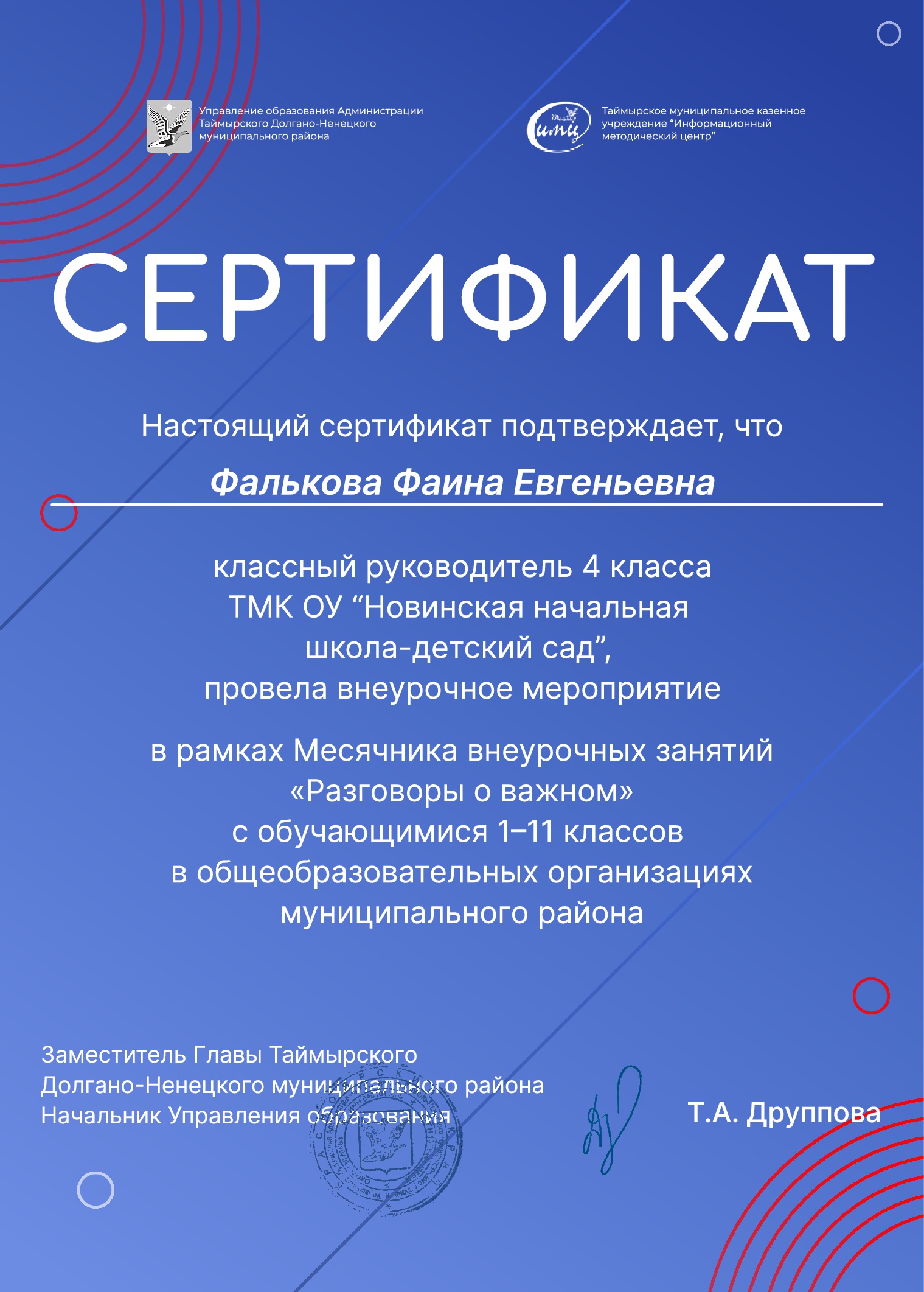 Участие педагогов в месячнике внеурочных занятий «Разговоры о важном». Сертификат, Фалькова Ф.Е.